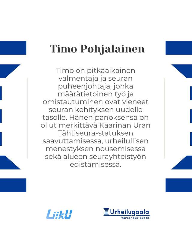 Seuramme pitkä aikainen puheenjohtaja ja valmentaja Timo Pohjalainen palkittiin Varsinais-Suomen urheilugaalassa vuoden seuratyöntekijänä. Tarkemmt perustelut palkitsemisesta voit lukea liitekuvista.