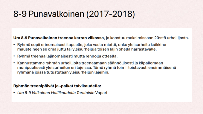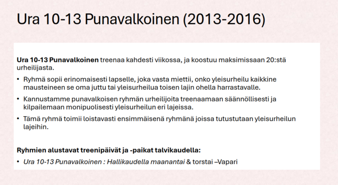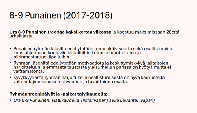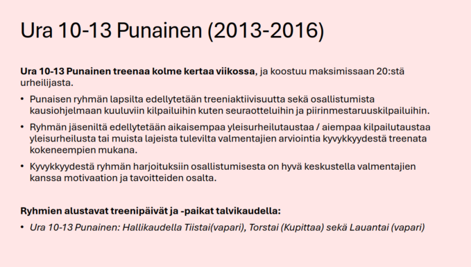 •Harjoitusryhmiin haetaan ja ryhmien valmentajat koordinoivat mahdolliset ryhmänsiirrot kesken kauden urheilijalähtöisesti + ryhmien tilanteen perusteella. Ryhmänvaihdot kesken kauden perustuvat ryhmän toiminnan soveltuvuuteen sekä urheilijan tavoitteisiin (ei mieluisampiin harjoituspäiviin).